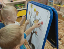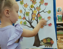 С ребятами вспомнили осенние приметы, листья деревьев, цвета, форму. Потанцевали с осенними кленовыми листьями, нарядили дерево в листочки а также укутали ежика в теплое одеяло из кленовых листочков.